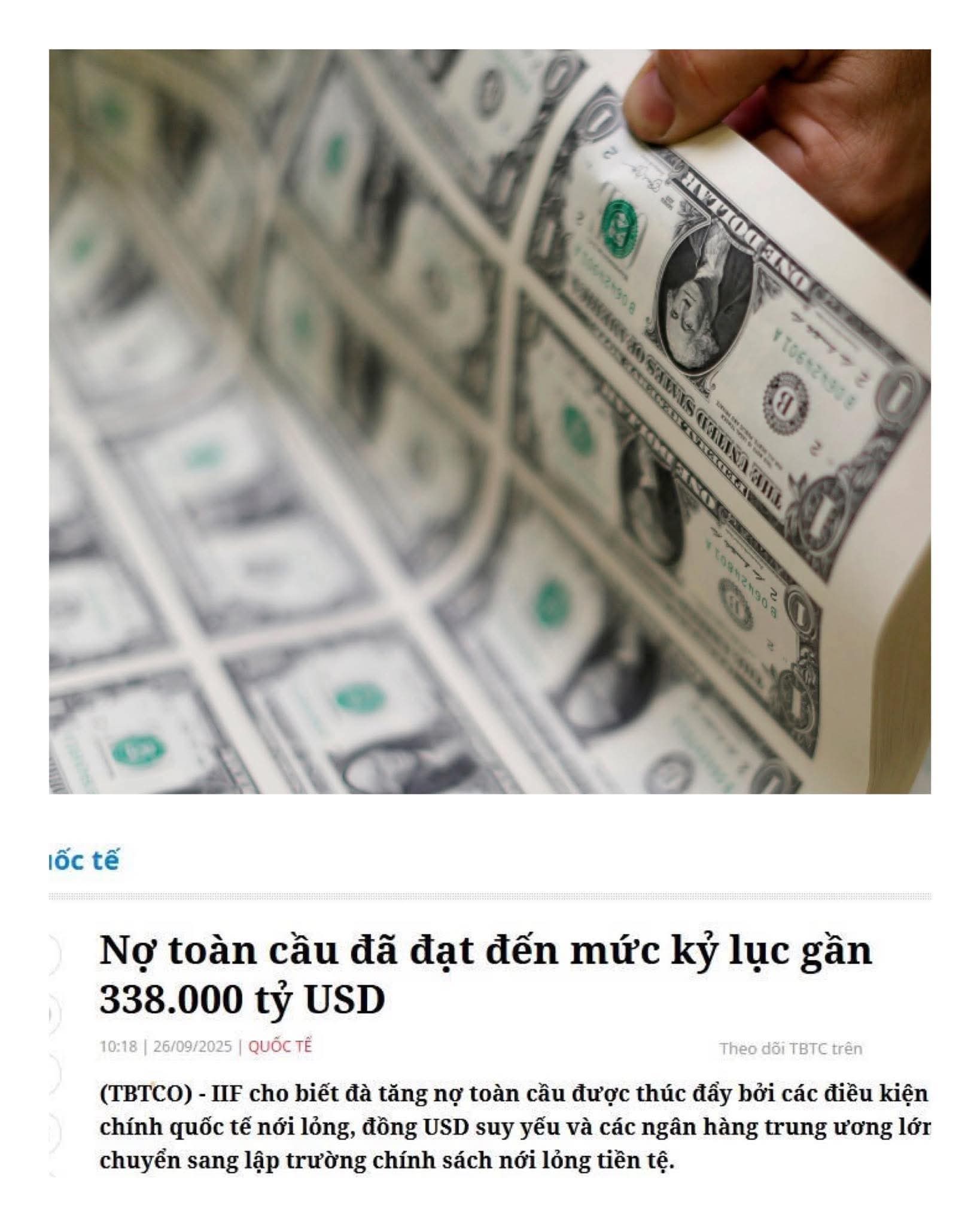 Nợ toàn cầu đã chính thức lập đỉnh mới gần 338 nghìn tỷ đô la. Con số này không chỉ là một kỷ lục tài chính, mà là tiếng chuông cảnh tỉnh cho toàn bộ hệ thống đang sống nhờ vào nợ và niềm tin. Bởi đằng sau mỗi đồng nợ được tạo ra, là một phần tương lai bị thế chấp và hôm nay, tương lai đó đang bị đem ra tiêu trước với tốc độ chưa từng có.