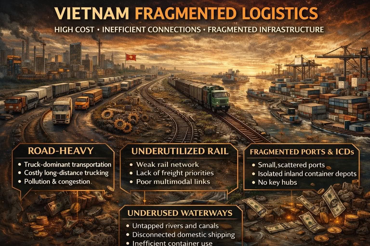 Khoảng cách 5–6% GDP không phải chuyện nhỏ. Với quy mô kinh tế hiện tại, đó là vài chục tỷ USD mỗi năm – tiền đang bị “đốt” một cách phung phí vào cấu trúc vận tải chưa tối ưu.