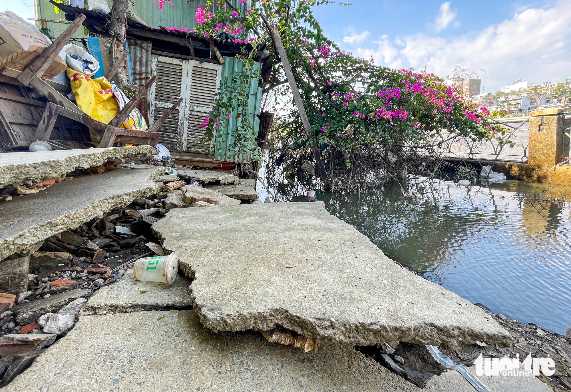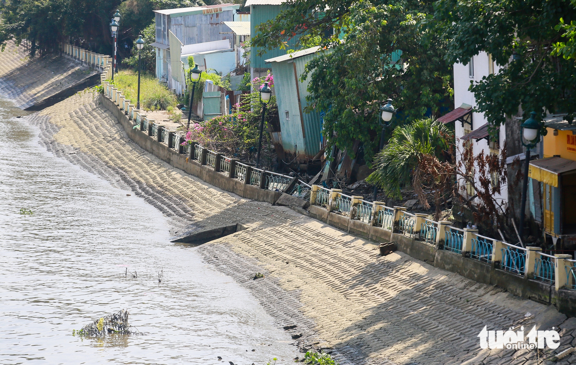 Một đoạn kè Thanh Đa sụt lún, xiêu vẹo - Ảnh: CHÂU TUẤN